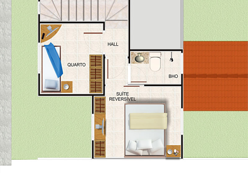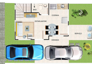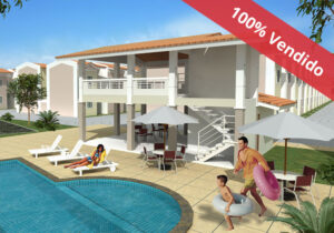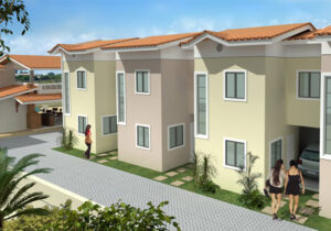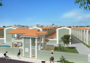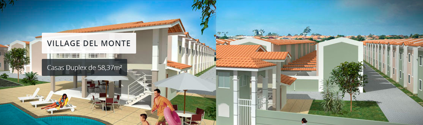Casas Duplex no bairro Siqueira em Fortaleza Ceará. Plantas com 54m² e 58,37m², 2 quartos sendo 1 suíte reversível, sala, cozinha americana, área de serviço, lavabo, vaga privativa, área de lazer, piscina adulto e infantil, deck com churrasqueira, salão de festas, espaço para academia e playground. R.02/80060
